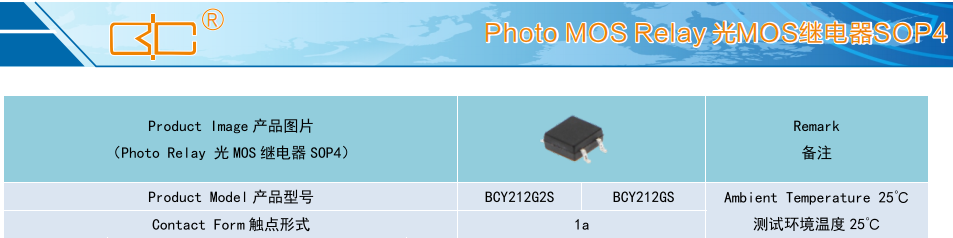(Relay 光 MOS 繼電器 SOP4),Product Model產品型號:BCY212G2S/BCY212GS,Contact Form 觸點形式:1a,Ambient Temperature 25'C,測試環境溫度 25°C