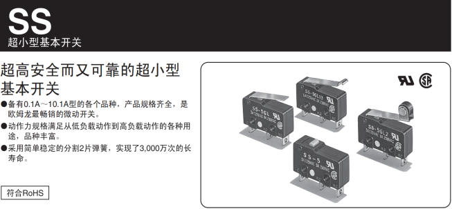 在體外診斷儀器的研發生產中,必定離不開一種重要組成零件,那就是開關。開關可在需頻繁換接電路的設備中進行自動控制及安全保護,廣泛應用在各式儀器儀表設備中,開關雖小,起的作用卻是不可替代的。像歐姆龍的SS超小型基本開關系列,不僅規格齊全,從0.1A~10.1A均有配備,而且機械壽命長,最高可達3000萬次,深受診斷儀器生產廠商的喜愛。廣州鼎悅電子科技有限公司專業代理歐姆龍微動開關SS-5GL,傳感器等;歡迎電話咨詢廣州鼎悅電子科技有限公司;相信我們可以帶給您不一樣的選擇;如圖: