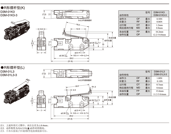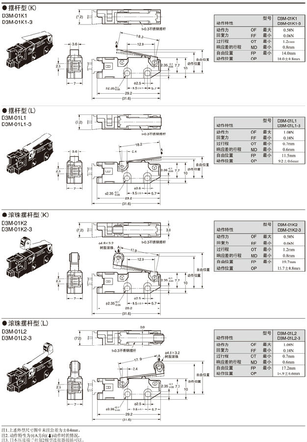 在針狀按鈕型中為了自由位置和總行程位置的數據,在擺桿型中為總行程位置的數據。 接點的閉路或開路在1ms以內。 |
