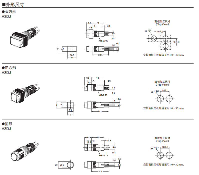 軀干長18mm、 圓軀干型f8系列 ●高亮度的均一表面發光。 ●圓形便于開孔。 ●形狀小巧,操作感好。