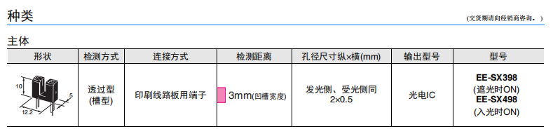 凹槽端子型(槽寬:3mm) ? 光電IC輸出(分為遮光時(shí)ON(EE-SX398)/入光時(shí)ON(EE-SX498) 2種類(lèi)型) ? 適用電源電壓為DC4.5~16V ? 可直接連接C-MOS