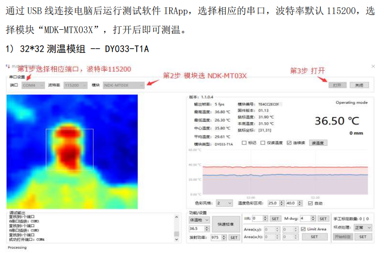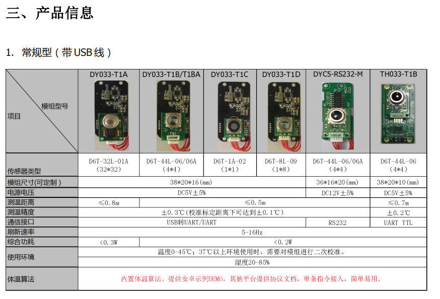 采用串口通信協議,波特率默認115200,8數據位,1停止位,無校驗。其中用戶控制端是主機,測溫模組是從機,采用一發一收。協議輸出數據有兩種查詢命令方式,一是只查詢人體溫度,二是查詢陣列溫度數據。