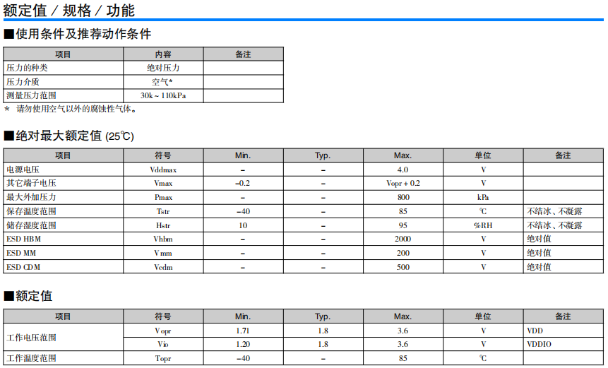 高精度·低消耗電流的小型MEMS絕對壓力傳感器 高精度地測量氣壓 內置低干擾的24bit ADC 基于I2C/SPI 接口的數字控制/輸出 在自動睡眠模式下實現低消耗電流 單獨的補償系數保存在OTP*中 (* One Time Programmable - ROM)