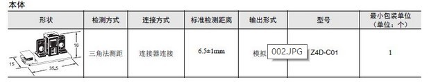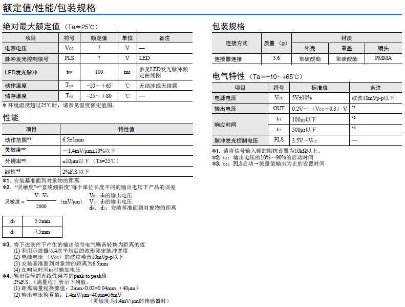 ±10 μm的高分辨率,適用于檢測紙幣、紙的重疊輸送或偏轉(zhuǎn)量。 利用除法運算,檢測物體顏色等反射率變化的性能好。 標(biāo)準檢測距離(動作范圍) = ± 6.5 ±1 mm。